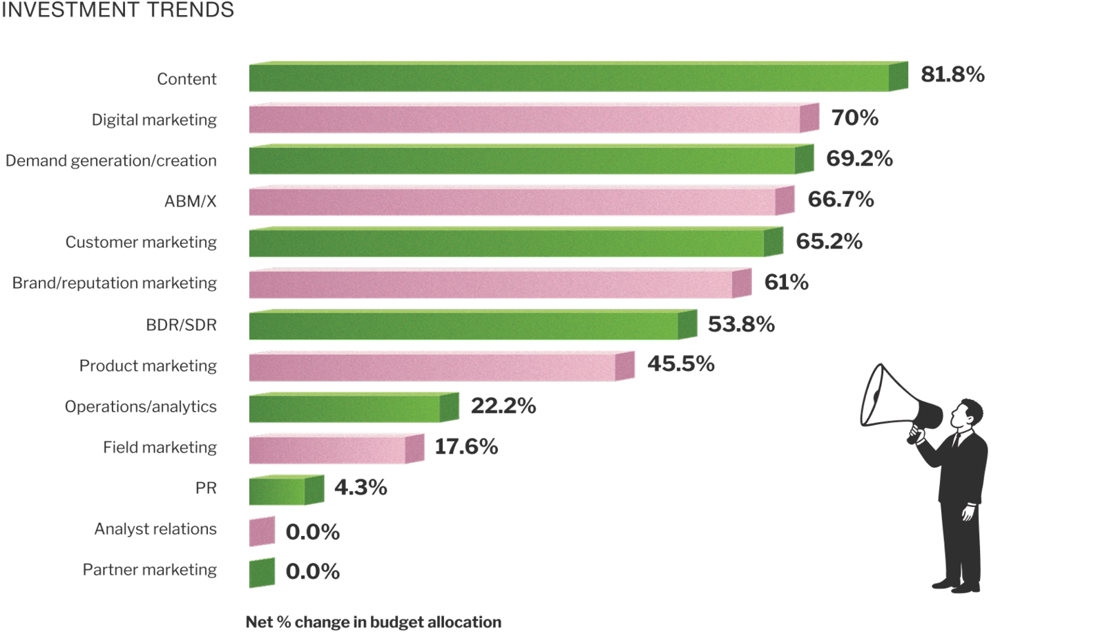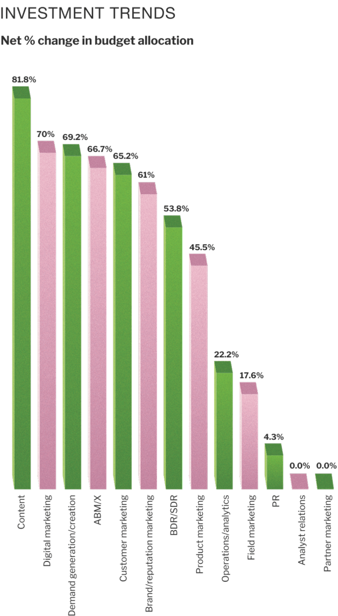 We asked marketers how they plan to distribute their budget during 2025. Activities seeing the highest net increase in investment (total respondents increasing less total respondents decreasing) include: